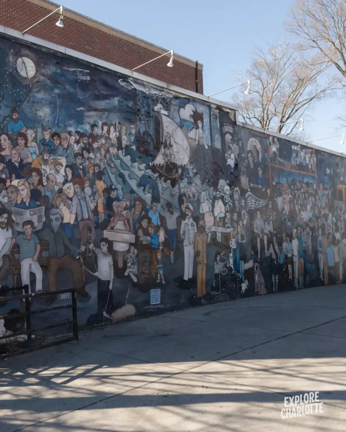 Four people stand by a vibrant Charlotte mural on brick, showing a serene face, bird, peach, and "EXPLORE CHARLOTTE" in the corner.